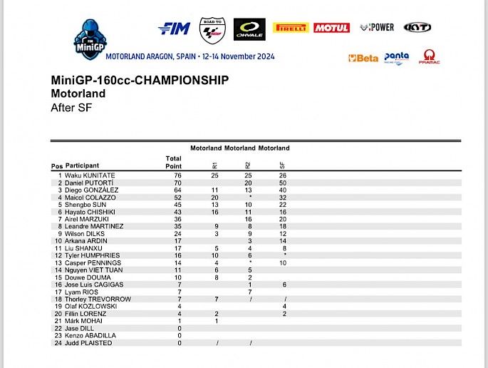 Putortí si nakonec odnáší celkovou druhou příčku se ztrátou šesti bodů na Kunitateho. Třetí končí Diego González.